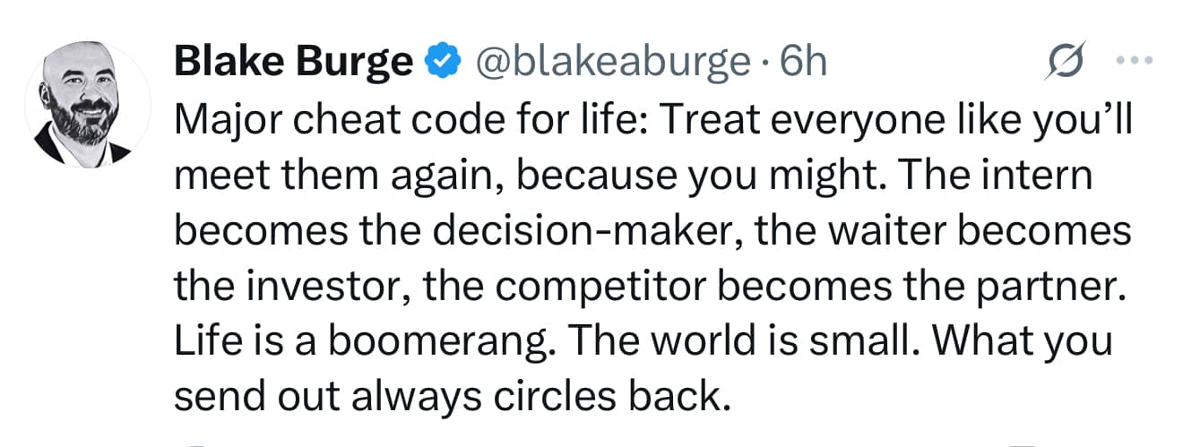 "Major cheat code for life: Treat everyone like you'll meet them again, because you might."